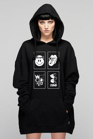 The oversized sweater has 'Rave Flyers' front print, front pockets, back hood, ribbon tie details and a regular fit.