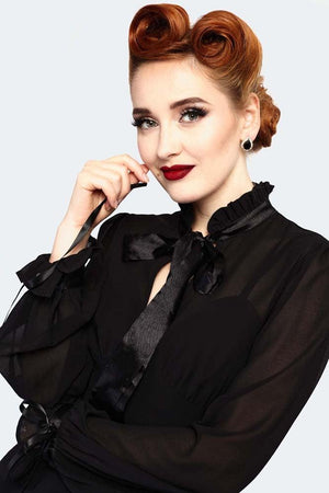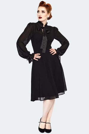 This Sheer High Neck Long Sleeve Ribbon Tie Dress by Voodoo Vixen offers vintage-inspired style. Featuring a sheer mid-length dress, plus balloon sleeves with ribbon wrist and neck ties, and an inner lining slip dress, this piece provides a look that is both timeless and elegant.
